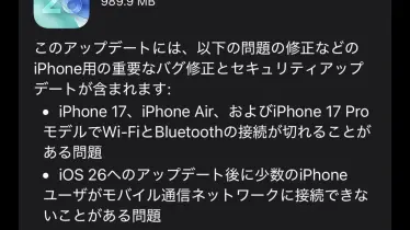 Apple Tips iOS26.0.1が配信開始!モバイル通信やWi-Fiが切れる不具合など多数修正!1件のセキュリティ修正も! 本日AppleがiPhone 11以降のiPhone向けにiOS26.0.1を、iPad向けにiPadOS26.0.1の配信を開始しました。今回のアップデートは、大型アップデートiOS26配信後初のアップデートであり、Wi‑FiとBluet... 2025.09.30 Apple Tipsiphonemac