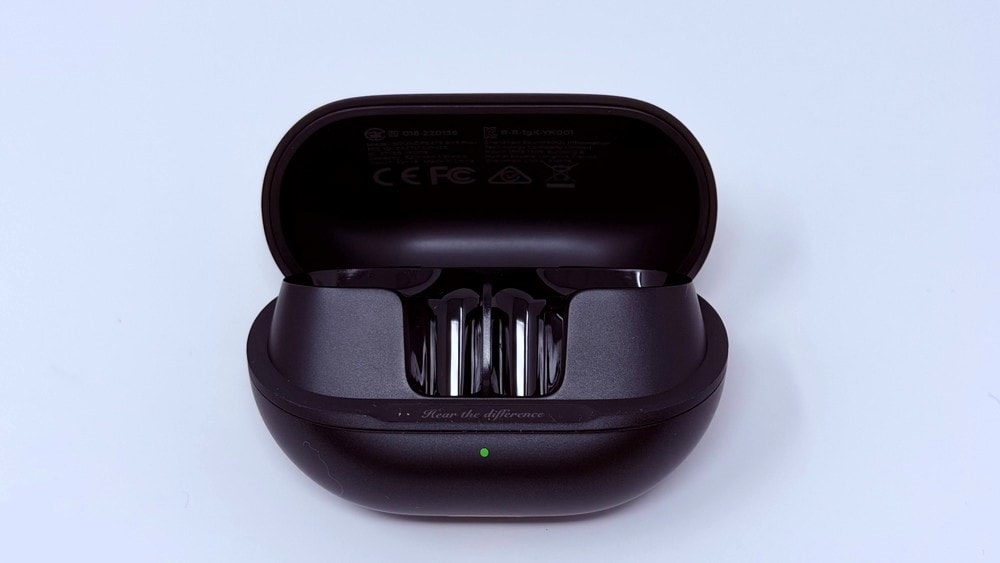 充電ケースはコンパクトで、胸ポケットに収まるサイズ感。前面からパカッと開く仕様により、イヤホンの取り出しやすさが向上しているのも地味ながら嬉しいポイントです。また、上位モデルらしく、細部までしっかり仕上げられており、なかなか高級感のあるデザインになっています。