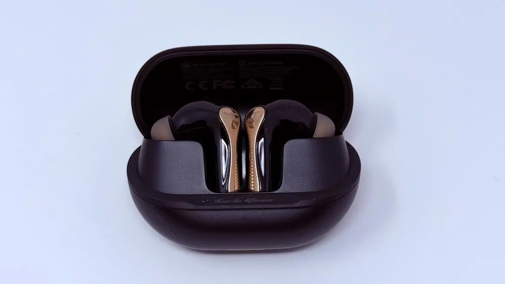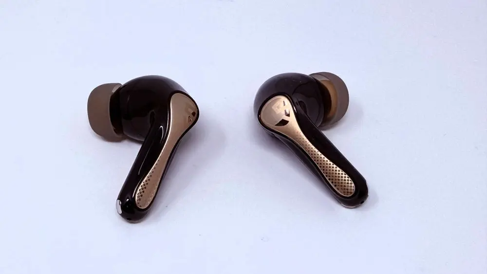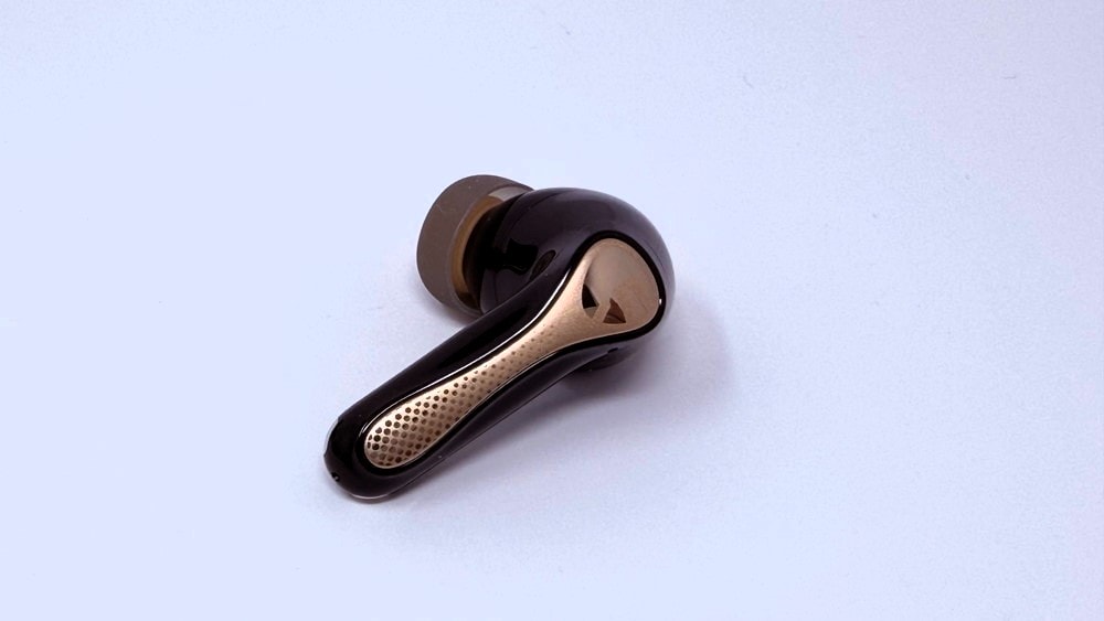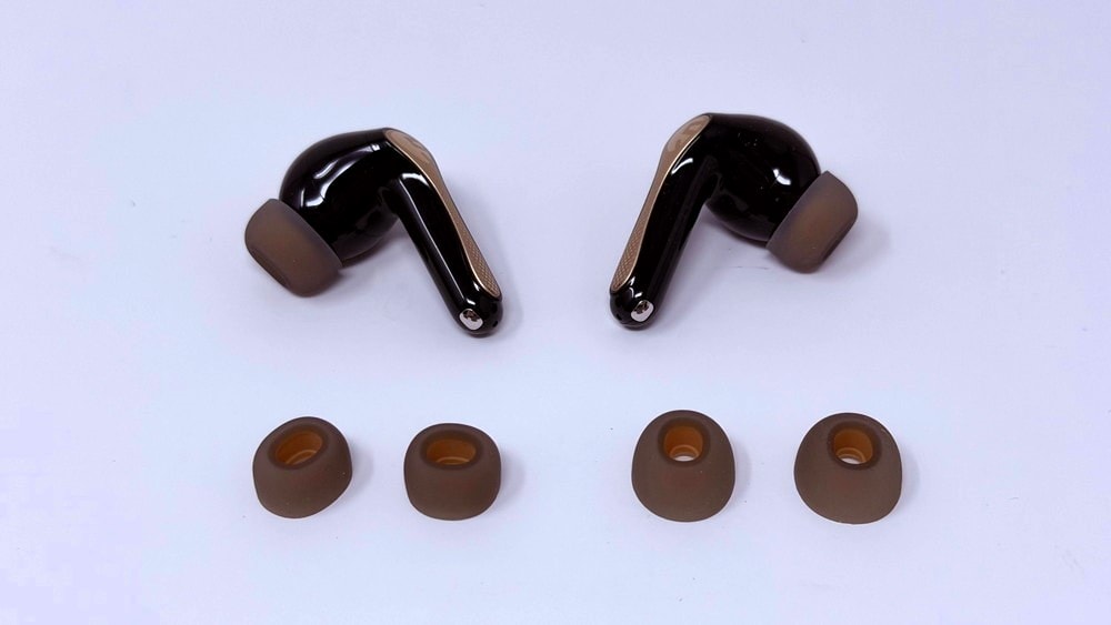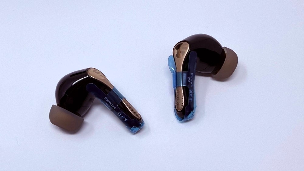 外観デザインは、前モデル「Air5 Pro」の流れを踏襲したスティック型スタイルとなっています。全体的にマットな質感で指紋が目立ちにくく、スタイリッシュな印象。イヤホン本体のステム部分にはゴールドがかったアクセントカラーが採用されており、高級感の感じられる仕上がりです。