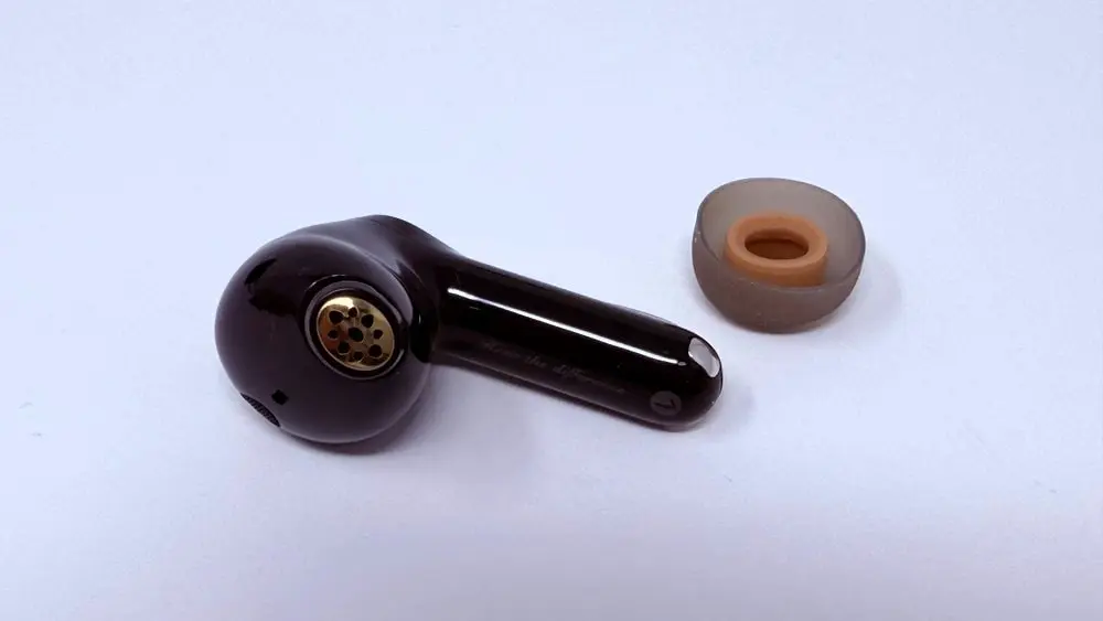 イヤーピースを外したところ。イヤホン本体のノズルは楕円形で、耳への圧迫感を軽減した設計。フィルター部分は金属素材が採用されており、上位モデルらしい質感のアップグレードが施されています。