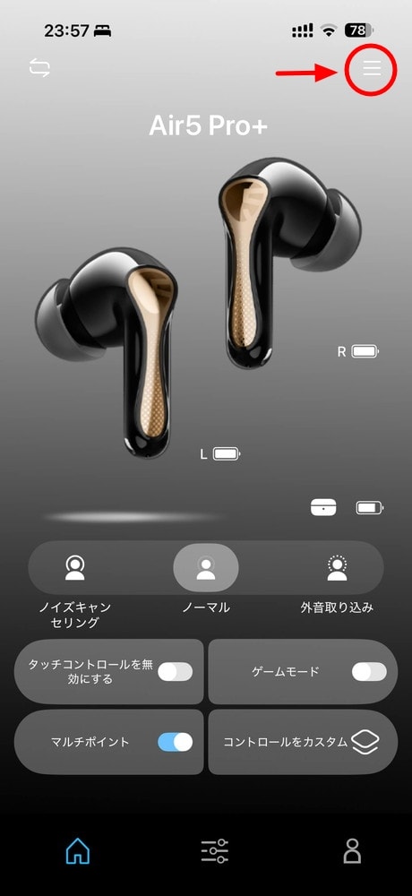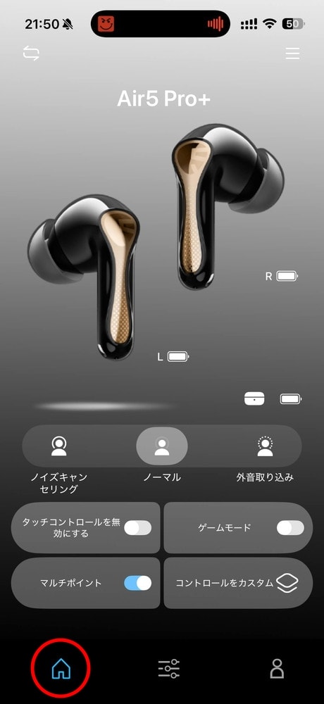 「ホーム」ではANCモードの切り替えなどが可能。