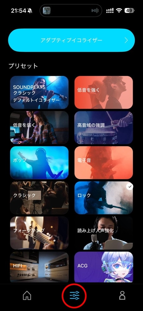 「イコライザー」では、アダプティブイコライザーやカスタムイコライザーなど、様々な音質の変化が楽しめます。