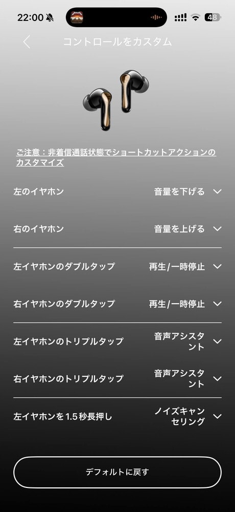 特にタッチ操作のカスタマイズ性が高く、左右それぞれに最大4パターンの操作を割り当てられます。また、EQで加えた変更はイヤホン本体に保存されるため、アプリを使わない状態でも設定が保持されます。