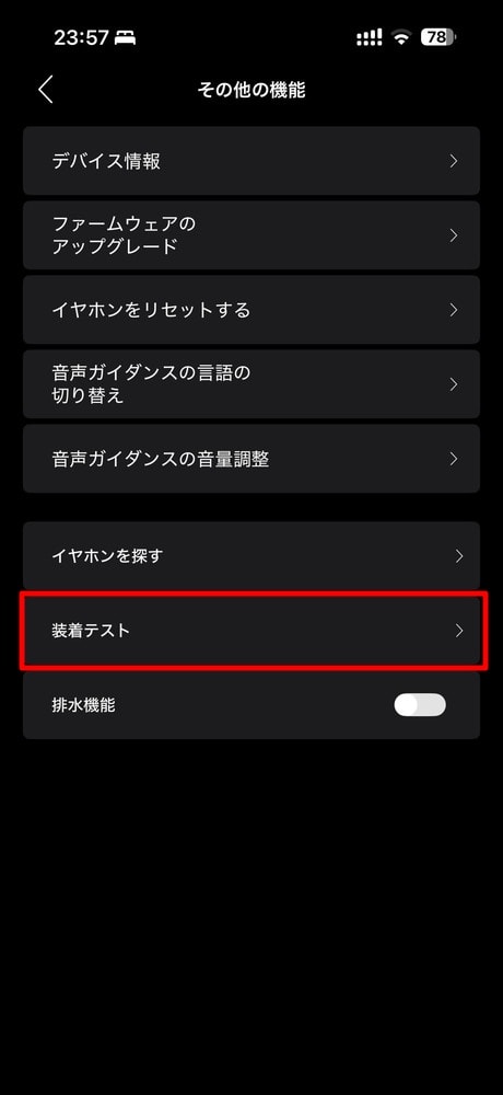 そして「イヤーピースフィットテスト」はぜひ利用しておきましょう。右上の「≡」をタップ。
