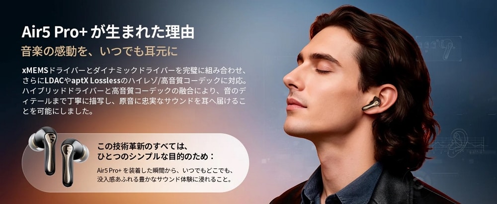 「Air5 Pro+」最大の特徴は、半導体製造技術を応用した次世代ドライバー「xMEMS製MEMSドライバー”Cowell”」と、10mmダイナミックドライバーを組み合わせたハイブリッド構成を採用している点。さらに専用のClass-Hアンプ(XAA-2000)まで搭載し、1万円台とはにわかに信じがたいほどの豪華なサウンド構成を実現しています。