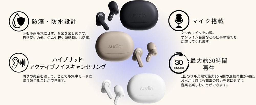 機能面でも充実しています。ハイブリッドANC(アクティブノイズキャンセリング)とウィンドノイズリダクションマイクを搭載し、通勤・移動中から屋外利用まであらゆるシーンに対応。さらにSudioのワイヤレスイヤホンとして初めてワイヤレス充電(Qi)に対応し、利便性も大幅に向上しています。前モデル「E3」と比べ、マイク性能と音質が向上し、通信規格もBluetooth 6.0へアップデートされています。